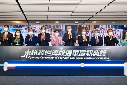 The East Rail Line cross-harbour extension will commence service on15 May 2022, allowing passengers from the Northeast New Territories and Central Kowloon to travel directly to Hong Kong Island without having to interchange. Accompanied by Chairman of MTR Corporation Dr Rex Auyeung, and Chief Executive Officer of MTR Corporation Dr Jacob Kam, Chief Executive of the Hong Kong Special Administrative Region, Mrs Carrie Lam Cheng Yuet-ngor, 14 May 2022 officiated at the Opening Ceremony for the new railway extension at Exhibition Centre Station and taking the train from Hung Hom to cross the harbour, marking an historic milestone in the development of the century-old East Rail Line (“EAL”).